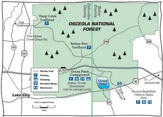 The Battle of Ocean Pond (Olustee), fought in 1864, took placed within the Forest on the Olustee Battlefield Historic Site. During this encounter Union soldiers attempted unsuccessfully to cut off major railroad supply lines to confederate troops.