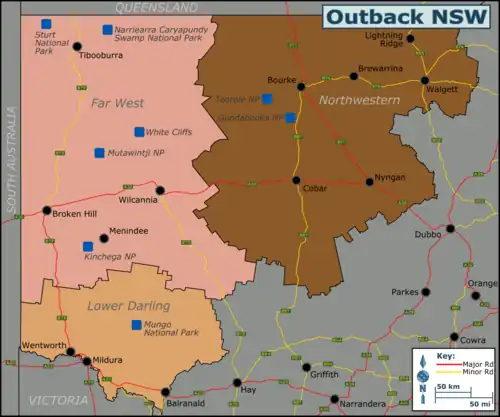 The Central West region is also sometimes considered to be part of the Outback. However, as the conditions and the environment in the Central West largely differ from the rest of the Outback, it is covered separately.
