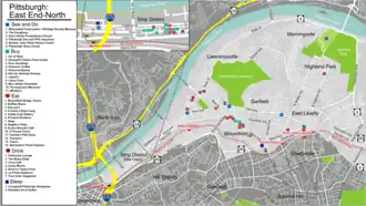 From downtown, simply take Liberty Avenue or Penn Avenue (they're parallel streets) east. You'll pass right through the Strip District. Stay on Liberty Avenue to get to Bloomfield. To get to Lawrenceville, get on Penn Avenue and continue east. Make a left on to Butler Street to get to Upper Lawrenceville, and continue on Butler to get to Highland Park and the Zoo. Staying on Penn Avenue will take you to Garfield and East Liberty.