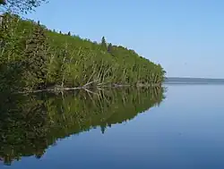 The main trees in the park are trembling aspen, paper birch, black spruce, white spruce, jack pine and balsam fir. Most travellers to the park will see elk (wapiti - different than European elk), white-tailed deer, much water fowl (ducks and geese) and many birds. Those who hike even short distances off highways may see foxes, black bears, moose (often standing in water, eating), and more rarely wolves and bison (buffalo). The lakes have many fish, and can be caught with a rod and reel - a National Parks fishing license is required. The types of fish often caught are northern pike (locally called "jackfish"), walleye (locally called "pickeral), white perch, whitefish. The park also has a restricted zone for travel at Lake Lavalee on the northern border where white pelicans breed. Most travellers would not venture "into the bush" by canoe and wet trail to make the restrictions important.