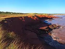 The park extends over 65 km (40 mi) of shoreline, including beaches, red sandstone cliffs and rolling sand dunes along the island's north shore, fronting the Gulf of St. Lawrence. The park ranges from several hundred metres to several kilometres in width.