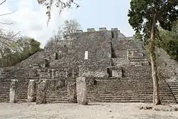Some of the site's monuments reflect an architectural style known as Peten style, but most of the site exemplifies the Rio Bec style common in this part of the Yucatan peninsula (though examples of it can be found at sites quite far from Campeche). The Rio Bec style evolved during the Late Classic period (600-900 AD) and is characterized by towers and stone mosaic facades, such as doorways carved to resemble the gaping jaws of a jaguar or anaconda.