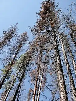- 🌍 Timber Creek Campground (along the Colorado River in the Kawuneeche Valley on U.S. Highway 34 approximately 10 miles north of Grand Lake). At 8,900 ft (2,700 m) elevation with 98 sites. This campground is open year-round starting in late May. It is first-come, first-served, with no reservations taken. Timber Creek Campground is the only campground on the west side of the park. A mountain pine beetle infestation caused most of the trees to be removed, so there is no shade at campsites. There is a recreational vehicle and trailer length limit of 30 feet. $30 per night (2020 rates).