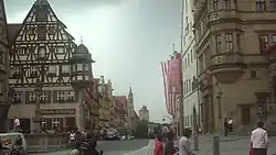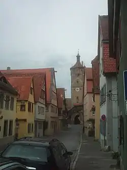 - The 🌍 Plönlein (Little Square), a few blocks south of the Market Square, offers a charming medieval sight. Standing at the right point, you can see two towers: on the left, more or less straight ahead, is the Siebers Tower (Siebersturm) dating from 1385; and down on the right, from the Tauber valley, is the Kobolzell Gate (Kobolzeller Tor) dating from 1360. These two access roads form a small triangular square, which is Plonlein. The Plonlein is often referred to as one of the most photographed spots in Germany.