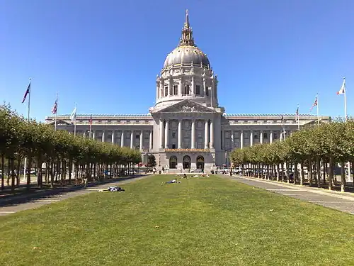 - 🌍 City Hall, 1 Dr. Carlton B. Goodlett Pl (between Van Ness Ave, McAllister St, Dr. Carlton B. Goodlett Place, and Grove St), ☏ +1 415-554-4933, fax: +1 415-554-4936, City.Hall.Building.Management@sfgov.org. Brochures are available for visitors to take a self-guided tour: M-F 8AM-8PM. Docent led tours: M–F 10AM, noon, 2PM. Designed by Arthur Brown Jr., and opened in 1915, the architecture of the building was heavily influenced by the "City Beautiful Movement," which in turn reflected the American Renaissance style of the time. Its "Beaux-Arts" dome (the fifth largest in the world) was modeled after that of St. Peter's Basilica in Rome, Italy. The building itself is huge, 393 feet long, by 273 feet wide, and 307 feet high — occupying a full two blocks of San Francisco's downtown real estate. It is considered by many admirers to be the most impressive building in the city. Inside, it features a large rotunda with a grandiose staircase leading up to the second floor. The walls are adorned with oak paneling and the ceilings with crystal chandeliers. City Hall is the site of much history — In 1954 Joe DiMaggio and Marilyn Monroe wed here. In 1978, Mayor George Moscone and Supervisor Harvey Milk were assassinated here. Tours: Self guided and docent led tours are free unless you're a private group of eight or more persons.