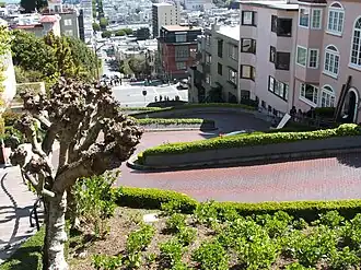 - π Lombard Street (between Hyde and Leavenworth). Do see the "crookedest street in the world", a one-block portion of Lombard Street that contains eight hairpin turns, created to reduce the hill's natural steep slope. The best time to see and photograph the winding street from the bottom (from Leavenworth St) is in the morning because Lombard Street runs east-west and slopes eastward. The best time to see and photograph the view from the top (from Hyde St) is in the afternoon. At night there are great views of Telegraph Hill and Coit Tower. The wild parrots of Telegraph Hill frequently fly over head in the morning.