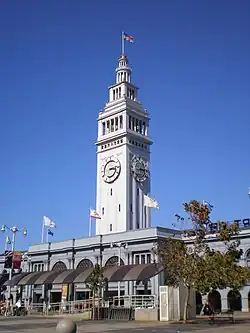 - π Ferry Building, One Ferry Building (at the end of Market Street on the bay), β +1-415-983-8000. A historic ferry terminal which survived the 1906 earthquake and fire and had 100,000 people pass through it every day before the bridges were built. It was renovated several years ago and now it's a great example of Bay Area "foodie" culture. Inside you'll find little shops selling artisanal bread (Acme), cheese (Cowgirl), chocolate (e.g., Recchiuti, Ghiradelli, Scharffen Berger, etc.), slow-drip coffee (Blue Bottle), and so on. There's even a stand selling vegan donuts! There are also a few excellent little restaurants and specialty markets as well as a large farmers market out front (Tuesdays and Saturdays year-round and on Thursday evenings in the summer). Together with its surroundings, the Ferry Building is beautiful to see, especially at night (although the shops will be closed at night). It's a popular place to visit for downtown office workers and tourists alike.