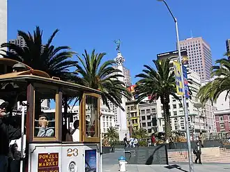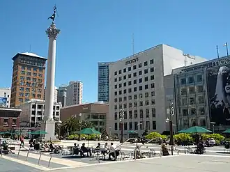 - π Union Square (between Geary, Post, Stockton, and Powell Sts). The most important site is the square itself, which was revamped in 2002 to provide more space for outdoor events and less space for napping homeless people (an earlier version of the square appeared in the film The Conversation). The square now includes a theater ticket outlet, gift shop, and Emporio Rulli Cafe, along with an underground parking garage. For blogging people-watchers, there is free wi-fi provided by the city. Look under the leaves of the greenery in the planters, and you'll find a few power outlets for your laptop.