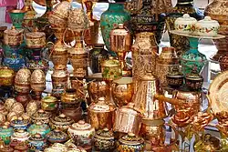 Most of the town's population, 82%, is employed in the making of copper items. There are 250 registered workshops in and around the town, which process about 450 tons of copper each year. Many of the copper items made are of a utilitarian nature – cooking utensils, various types of containers, pots, pans, plates, shot glasses, clocks, jewelry, vases, beds, tables, chairs, light switches, counters, sinks, even bathtubs, and much, much more, all in copper. However, since the 1970s copper jewelry, and many other non-essential items has also been made here. The workshops here are family-owned with children learning the trade from their parents. There is also a cooperative school-workshop to teach coppersmithing, named Vasco de Quiroga.