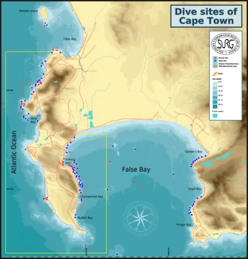 There are three marine protected areas associated with the coastal waters of Cape Town: The Table Mountain National Park Marine Protected Area which includes most of the reef dives and a large number of the wrecks, the Robben Island Marine Protected Area, with mostly wrecks, but not so many and some quite deep, and the small Helderberg Marine Protected Area, with very few dive sites.