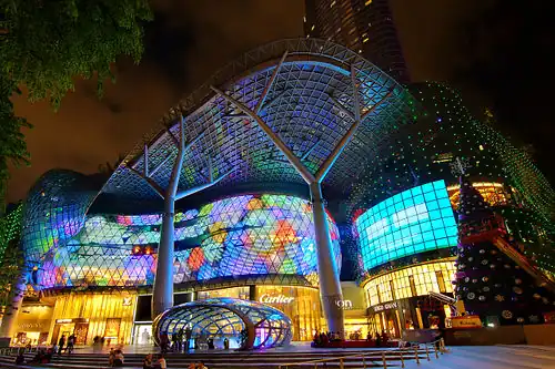 - 🌍 ION Orchard, 2 Orchard Turn (integrated with Orchard MRT). Covered in pulsating neon lights at night, this is Orchard's flashiest mall in more ways than one, extending four floors both above and under ground. The first few floors are dominated by high-street flagships for Louis Vuitton and co, but the interior and basement have plenty of more affordable options including Japanese retailers Uniqlo and Muji. The fourth floor has the ION Art gallery, while the basement 4 Food Opera food court, while a bit pricey by Singapore standards, is enormous and very popular. Located on levels 55 and 56, at 218 metres, ION Sky offers a 360-degree view from the highest point on Orchard Road.