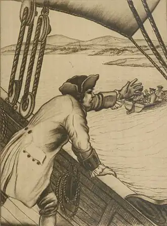 - "Right in the midst of the narrows lies an islet with some ruins; on the south shore they have built a pier for the service of the Ferry; and at the end of the pier, on the other side of the road, and backed against a pretty garden of holly-trees and hawthorns, I could see the building which they called the Hawes Inn."