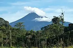 The volcano has a broad crater covered in jungle foliage with a small crater lake.