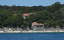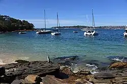 Situated near to Double Bay, and not serviced by scheduled ferries. You will need to reserve a place and pay a fee of approximately $7 per head to the National Parks and Wildlife Service. Additionally, you also can't moor a boat here.