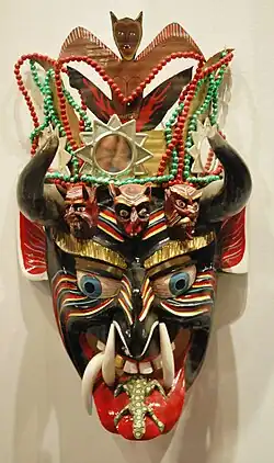 Masks are made of animal and human faces, but some of the most dramatic (and popular) masks are devils and demons. Facial features are painted on the mask which may have animal hair glued on or even jewelry or other objects.