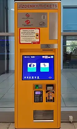 - Remember to validate your ticket as soon as you get on the bus (or before, if possible) by sticking it into a yellow machine with green glowing arrow, or you may be subject to a fine of 1,500 Kč (June 2025) if you are caught. Insert the tickets into these machines in the direction of the arrow printed on them and with the arrow pointing upwards. The ticket has to be validate only at the beginning, it is not marked at the transfer.