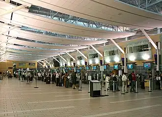 Check-in at the Main Terminal is shared in a single row with the following order by direction of travel incoming to the airport: US Check-in, International check-in, and Canada check-in. Self check-in stations are available throughout the Main Terminal and the process of drop bags is relatively quick process with short lines.