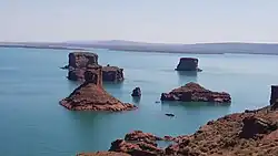 - 🌍 Picún Leufú. About 50 km south-west of El Chocón, a slightly larger (3500 inhabitants) but still quiet town in an oasis near the Ramos Mexia lake. There are several nice lake beaches at 10-15 km of the town reachable via regular dirt road (usable by normal cars, but drive slowly), but only one (the Club de Pesca) has infrastructure with toilets, shadow and a campground for a small fee. The town is pleasant and modern, it has several restaurants and shops and a small gas station. It's not touristy at all, but has several small hotels and apartment complexes, mostly for travellers on the way to Bariloche.