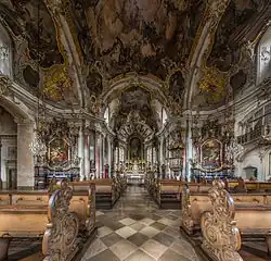 - 🌍 Käppele (Little Chapel), Spittelbergweg 21 (take bus 35 to Käppele bus stop, walk down the second alley on the left at the dead end; for access from the Stations of the Cross, turn left to the pathway at Nikolausstraße, make another left at the end, and turn right in front of the Germania House), ☏ +49 931 79407760. Daily 08:00-17:00. A church at the hillside near the fortress. From its humble beginnings as the site of an erected pieta in 1640, at which at least four miracles were reported, a chapel was then built around it. Balthasar Neumann, the same architect that designed the Residence, built a church that incorporated the old chapel in 1750, though the interiors were actually not finished until 71 years later. Because of its extensive collection of life-size statues and classic interior, being the only church intact during the 1945 bombing, it is an extremely popular place for weddings, in addition to pilgrimage during the Marian holidays and Pentecost. Behind the church are the Stations of the Cross staggered on 5 floors, with each of the station hosting meticulously carved statues at least two meters wide.