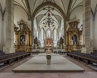 - 🌍 Neumünster (Neumünster St. Johannes Evangelist und St. Johannes der Täufer), +49 931 38662900. Daily 08:00-18:30. Mightily standing from the 11th century and now clipped between shops, its narrow pink Romanesque facade gives way to Baroque beauty inside. The white wall is a nice contrast to gold finishes and colorful altar and murals. Something also worth looking is a Madonna from the workshop of Tilman Riemenschneider and the St. Kilian's Crypt.