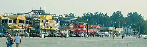 The beach is divided into sections, with the beaches numbered 1 to 6 from east to west, with off-beach public park areas, mostly with parking and all with toilet facilities. Beaches 2-4 benefit from shade trees, a bike trail and a playground. Beach 1 is the most touristy, with bars, beach-themed shops and fast food restaurants, attracting primarily young adults. Beach areas 3 to 6 have many seasonal waterfront cottages between the park areas; Shore Lane Rd. is used for jogging, biking and roller blading. There are two additional beaches nearby, New Wasaga Beach and Allenwood Beach that are cut off from the 1-6 areas by the river; these also have seasonal residents. The town publishes a map of all of these areas.