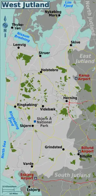 - 🌍 Holstebro — The town is wellknown for its cultural life and industry, even outside the region, and within the region, it is an important trade center as well, mostly retail. At around 37,000 residents, Holstebro is the next largest settlement in West Jutland.