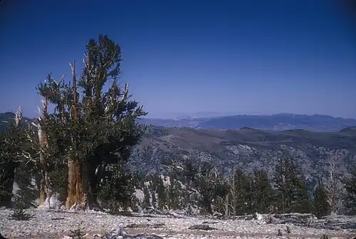 Semi-desert with sagebrush up to a lower timberline at 6,500 ft (2,000 m), then Single-leaf Pinyon Pine and Utah Juniper to about 9,000 ft (2,700 m), Mountain Mahogany brush for the next 600 ft (200 m), then Limber Pine and Bristlecone Pine to an alpine timberline at 11,000' (3,300 m). Sagebrush and grass reach 12,000 ft (3,700 m), scattered alpine plants reach 14,000 ft (4,300 m). Birch and Aspen, including some dwarf Aspen along streams. Small residual stands of Ponderosa Pine, Jeffrey Pine, Lodgepole Pine and Sierra Juniper.